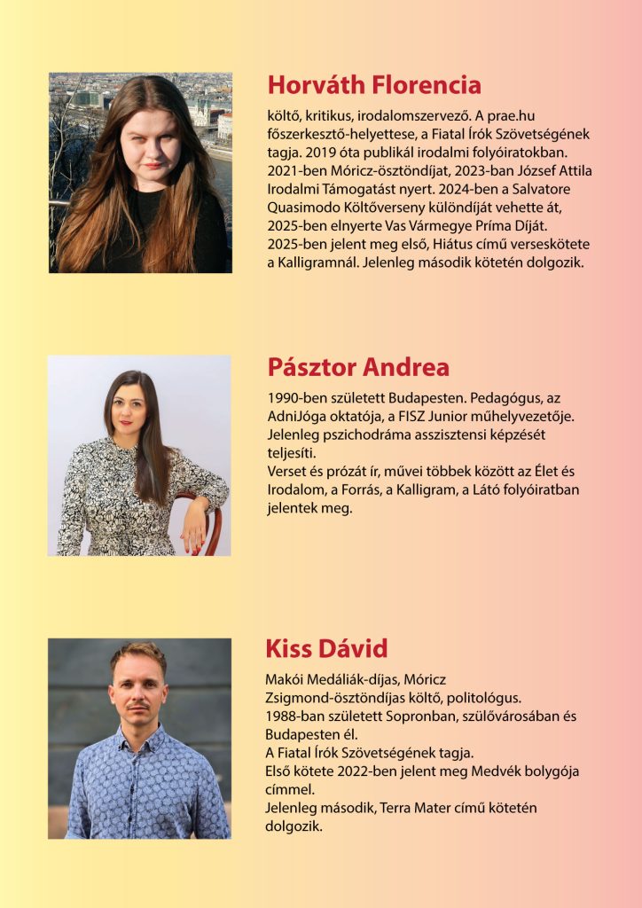 A Lendvai Könyvtár és Kulturális Központ és a Muravidéki Pedagógusok Egyesülete sok szeretettel vár minden érdeklődőt a magyar költészet napja alkalmából a Tudástér című előadássorozat keretében Horváth Florencia és Pásztor Andrea fiatal költők bemutatójára 2026. április 13‑án, hétfőn 18.00 órai kezdettel a Lendvai Könyvtár épületébe. A költőkkel Kiss Dávid költő beszélget. A belépés ingyenes. A program magyar nyelven folyik.
